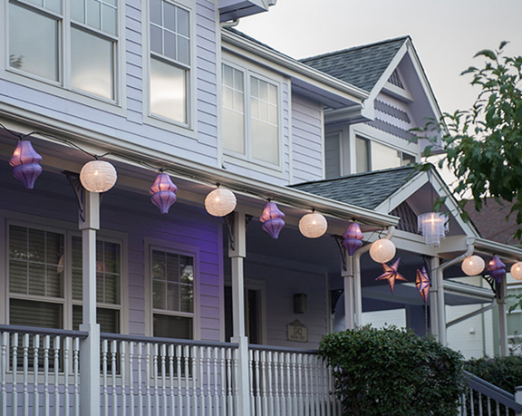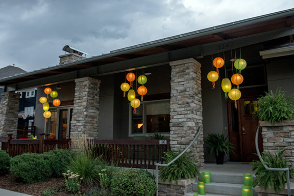 ![]() We're partial to the traditional paper and silk lanterns. Much of our display is lit by incandescent bistro strings hanging from tiny brass cup hooks. The cup hooks are discrete and weatherproof, so we leave them up year round. If you use cup hooks, we recommend solid brass, which will darken slightly but not rust. For the cables, we like FEIT brand bistro lights. They're good quality, made for use outdoors, and come with several convenient features. The bulb sockets hang down a few inches from the cable, allowing room to either attach a lightweight lantern and drop the bulb down inside. The bulbs are spaced at 2 or 3 ft intervals, the ideal width for average lanterns. At each bulb interval, there is an eyelet to allow you to hang the cable onto hooks on the soffits, fascia, or ceiling of your porch. FEIT bistro lights can be purchased in different lengths. The incandescent strands with 11 watt bulbs give a warm, soft glow to your display. The sockets and cables are also sturdy enough to add extensions for longer lanterns. Since the displays will be left up all week during the festival this year, you may want to consider weatherproofing your lanterns as much as possible. Place your more delicate and paper lanterns under the porch roofs and eaves where possible, and fasten your lanterns with cable ties. If your lanterns get wet, wait until they're dry to handle. ![]()