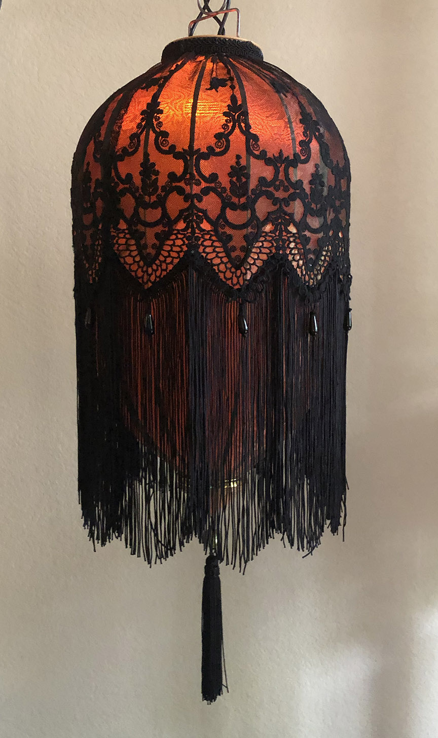This lantern is made from moss polysilk brocade on a steel frame, embellished with embroidered black tulle lace, fringe,
