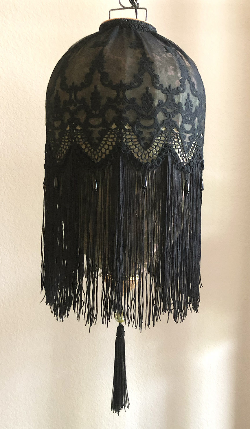 black glass drops and black crystals. It measures 17” in height (28" with tassel).