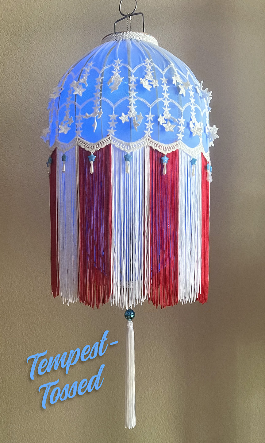 This lantern is made from blue polysilk on a steel frame, embellished with white embroidered tulle lace, red and white fringe,