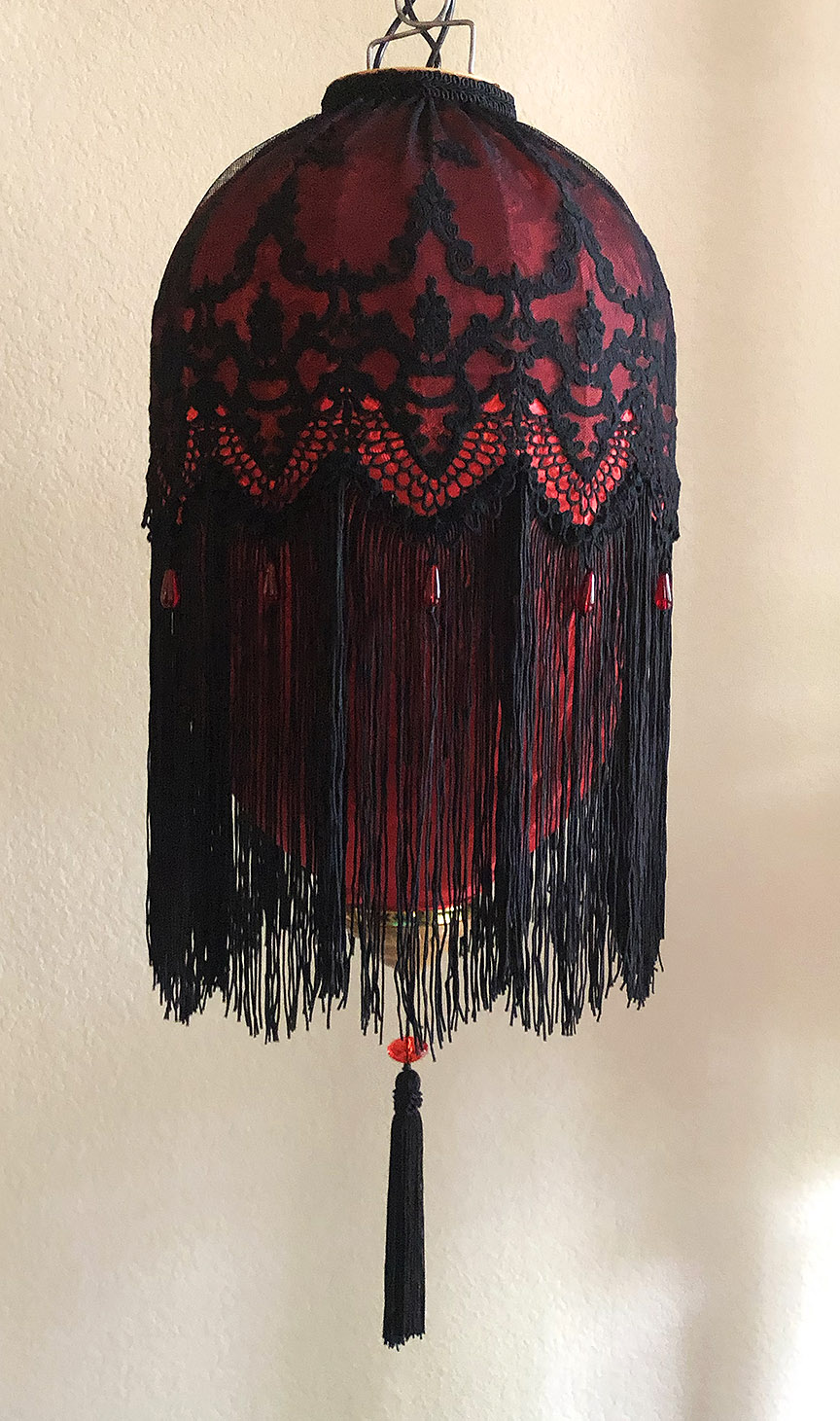 This lantern is made from red polysilk brocade on a steel frame, embellished with embroidered black tulle lace, fringe,